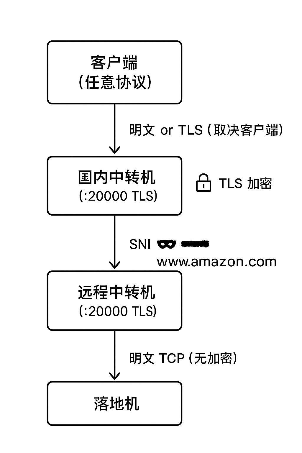 remote_transport = "ws;host=amazon.com;path=/chat"上述配置中,listen段为中转机的连接端口,可自定义。remote段为落地机的传入端口,listen_transport段为隧道伪装的domain,自行更改。